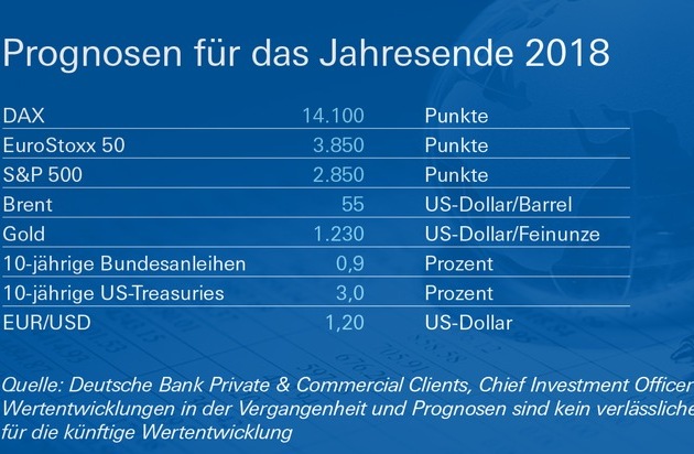 - DAX-Ziel für Ende 2018: 14.100 PunkteDie Weltwirtschaft sollte im Jahr 2018 anhaltend solide wachsen und die US-Geldpolitik sich allmählich normalisieren. Damit rechnen die Kapitalmarktexperten der Deutschen Bank in ihrem heute in Frankfurt veröffentlichten "Kapitalmarktausblick 2018". Sie weisen allerdings auch auf mögliche ökonomische Gefahren hin, vor allem auf eine zu schnell steigende Inflation. "Wenn der Preisdruck stärker als erwartet zunehmen sollte, könnten sich die Notenbanken zu einem aggressiveren Ausstieg aus ihrer nach wie vor expansiven Geldpolitik gedrängt fühlen - mit entsprechend negativen Auswirkungen auf die konjunkturelle Entwicklung weltweit", sagte Stefan Schneider, Chefökonom für Deutschland bei Deutsche Bank Research.