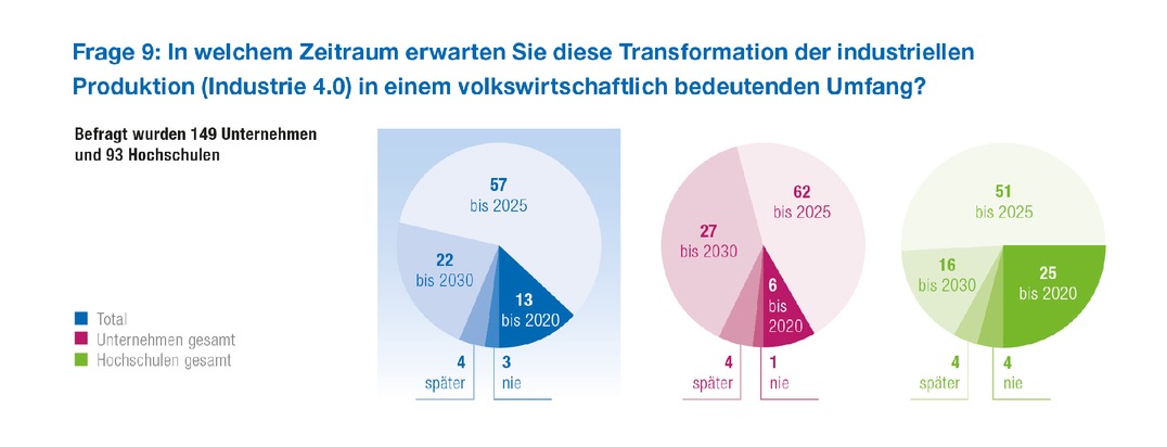 Die Smart Factory wird bis spätestens 2025 real und verbessert damit die Wettbewerbsfähigkeit Deutschlands in großem Maß. Davon sind nach einer aktuellen VDE-Studie fast drei Viertel der befragten 1.300 Mitgliedsunternehmen und Hochschulen der Elektro- und Informationstechnik überzeugt. Jedes dritte befragte Unternehmen befasst sich bereits konkret mit Industrie 4.0, 70 Prozent befinden sich in der Analysephase. In operativen Einzelprojekten beschäftigt sich etwa ein Drittel mit dem Thema, in der Planungs-/Testphase etwa ein Viertel. Der Studie zufolge werden der Automobil- und Maschinenbau, gefolgt von der Elektrotechnik und Logistik am meisten profitieren. Jeder zweite glaubt, dass vor allem der Mittelstand bei Industrie 4.0 gewinnen wird. Allerdings ist die Mehrheit der Befragten auch davon überzeugt, dass sich der internationale Wettbewerb um die Technologieführerschaft in der Produktion in den nächsten Jahren stark verschärfen wird und Deutschland aufpassen muss, angesichts der US-Dominanz bei der technischen Software und Internet-Plattformen bzw. deren Verknüpfung zu Anwendungen in Handel und Industrie ("Big Data") im Innovationswettlauf um Industrie 4.0 nicht zurückzufallen. Jeder vierte Befragte befürchtet, dass die deutsche Industrie zu lange an klassischen Produktionsmethoden festhält.