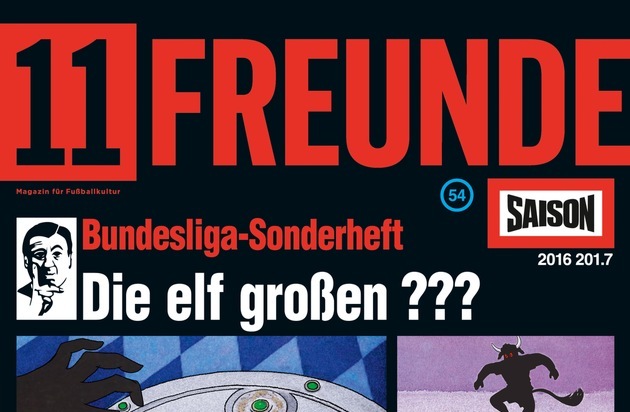 Im August startet wieder die Fußball-Bundesliga. Zur richtigen Einstimmung auf die neue Saison ist ab heute die 177. Ausgabe der 11FREUNDE als Bundesliga-Schwerpunktheft im Handel erhältlich. Auf 164 Seiten gibt es eine unterhaltsame Vorbereitung auf die neue Spielzeit. Außerdem enthält das Bundesliga-Sonderheft den 196-seitigen Pocketplaner "Alle Teams, Spieler & Termine" sowie ein Spielplanposter für die 1. und 2. Bundesliga. Nach den kreativen Covern der letzten Jahre, die auf "Star Wars", "Breaking Bad" oder "Zurück in die Zukunft" anspielten, präsentiert sich das Titelbild für die neue Saison im Look der Hörspiel-Reihe "Die drei ???".