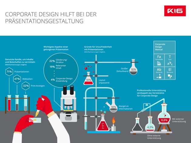 Gerade in solchen Situationen sollte durch richtige und konsequente Anwendung des Corporate Designs das Unternehmen aus einem Guss dargestellt werden. Schließlich sind Präsentationen für fast drei Viertel der deutschen B2B-Unternehmen nach wie vor der wichtigste Kanal für die Vermittlung von Inhalten und Botschaften. Ein einheitliches Auftreten und Erscheinungsbild ist daher von höchster Relevanz für die Markenentwicklung und -pflege. Es wartet also noch viel Arbeit auf die Kommunikations- und Marketing-Abteilungen.