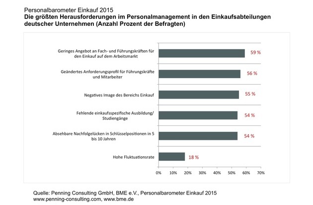 Ein geringes Angebot an Fach- und Führungskräften auf dem Arbeitsmarkt, deutlich veränderte Aufgabenprofile von Mitarbeitern und ein anhaltend negatives Image auch im eigenen Unternehmen sind die drei größten Herausforderungen des Einkaufs deutscher Unternehmen. Das ist das Ergebnis des Personalbarometers 2015 des Bundesverbandes Materialwirtschaft, Einkauf und Logistik e.V. (BME) und der auf Personal- und Change-Management spezialisierten Unternehmensberatung Penning Consulting.
