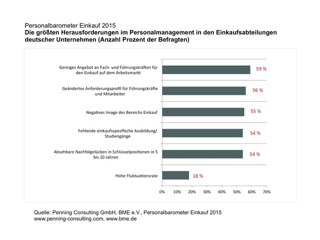 Ein geringes Angebot an Fach- und Führungskräften auf dem Arbeitsmarkt, deutlich veränderte Aufgabenprofile von Mitarbeitern und ein anhaltend negatives Image auch im eigenen Unternehmen sind die drei größten Herausforderungen des Einkaufs deutscher Unternehmen. Das ist das Ergebnis des Personalbarometers 2015 des Bundesverbandes Materialwirtschaft, Einkauf und Logistik e.V. (BME) und der auf Personal- und Change-Management spezialisierten Unternehmensberatung Penning Consulting.