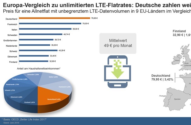 "Auch im Verhältnis zum durchschnittlich monatlichen Haushaltsnettoeinkommen[1] ändert sich nichts am Ranking und verweist Deutschland abermals auf das Ende der Liste", sagt Sebastian Schöne, Tarifexperte vom Ratgeberportal LTE-Anbieter.info. "Wie unsere Analyse zeigt, müssen Verbraucher hierzulande im Schnitt 3,42 Prozent des monatlich verfügbaren Haushaltseinkommens für einen unlimitierten LTE-Tarif am Smartphone aufwenden. Dagegen sind es z.B. in der Schweiz, Großbritannien und den Niederlanden unter 2 Prozent. Im Fall von Dänemark und Finnland sogar weniger als die Hälfte wie hierzulande, das hat uns schon überrascht!".
