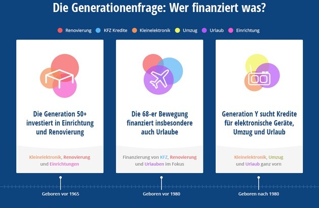 Sie ist nach wie vor in aller Munde: Die Generation Y und damit alle ab 1980 geborenen Personen. Und nicht nur im Arbeitsbereich scheinen sich die Wünsche und Bedürfnisse der Generation Y von vorigen Generationen zu unterscheiden. So stehen bei ihr Finanzierungen für elektronische Konsumgüter wie etwa Mobiltelefone, Umzug und Urlaub in der Rangliste ganz vorne. Am reisefreudigsten sind dabei Kreditnehmer aus Bayern und Thüringen. Auch die Generation der sogenannten 68er-Bewegung setzt bei der Anfrage eines Kredits neben der Renovierung und Autofinanzierung insbesondere auf Urlaubsfinanzierungen.