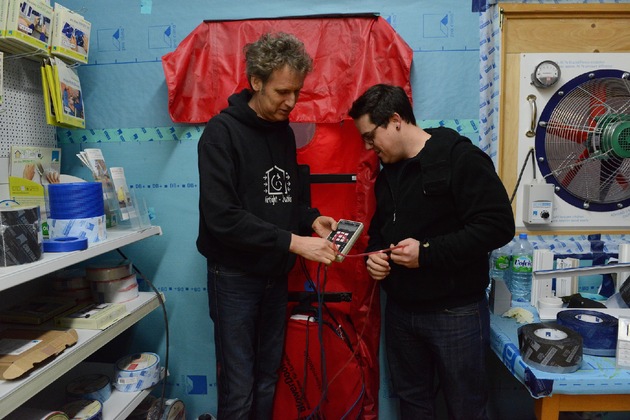 1_Abb1_BD_Aufbau.JPG 1_Abb1_BD_Aufbau.NEF: Referent Holger Merkel (links) mit Architekt Dennis Krupp: Die Teilnehmer lernen beim BlowerDoor- Basisseminar, wie das Equipment auf- und abgebaut wird.