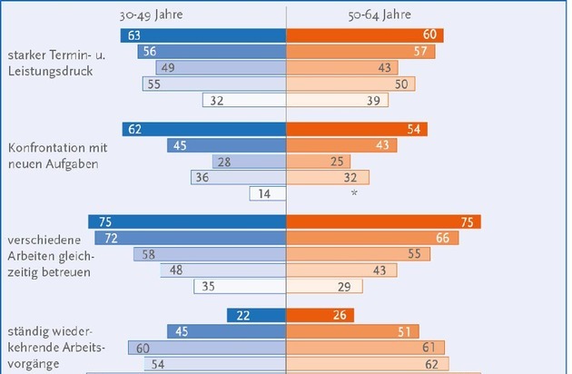 Starker Termin- und Leistungsdruck wird altersübergreifend am häufigsten von Führungskräften und Akademikern genannt. In den Dienstleistungs- und Handwerksberufen bestätigen dies häufiger die Befragten mittleren Alters. Von sich ständig wiederholenden Arbeitsvorgängen berichten vorwiegend Beschäftigte der gering qualifizierten Berufsgruppe (76 %). Hier lässt sich kein nennenswerter Unterschied zwischen den Altersgruppen feststellen.