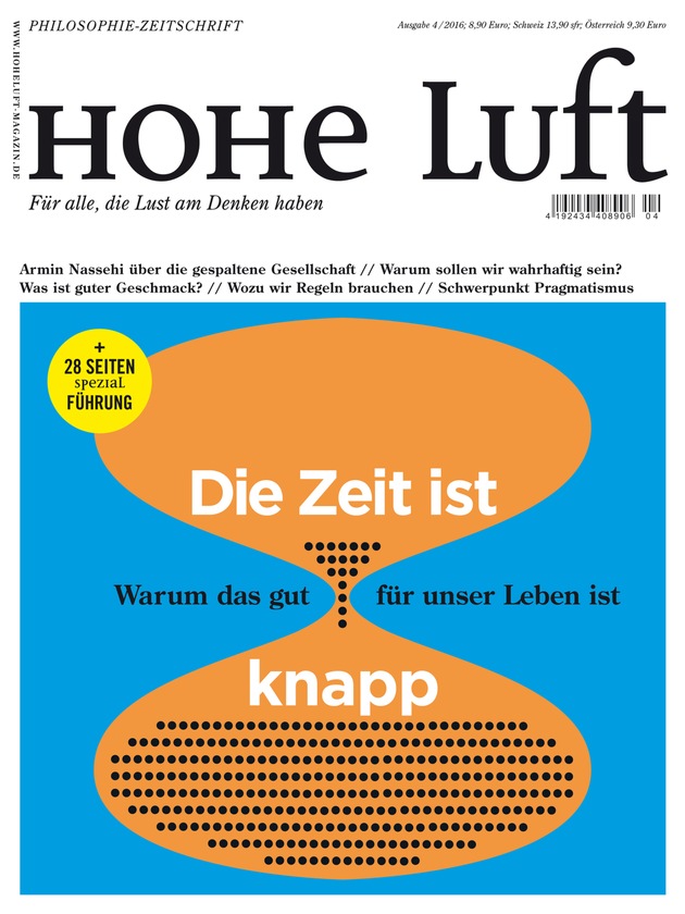 HOHE LUFT betrachtet aktuelle und bewegende Themen aus Gesellschaft & Kultur, Politik & Wirtschaft aus einem philosophischen Blickwinkel und eröffnet dem Leser überraschende Perspektiven auf Grundfragen des Lebens. HOHE LUFT erscheint alle zwei Monate in der HOHE LUFT Verlag UG (haftungsbeschränkt) & Co. KG zu einem Copypreis von 8,90 Euro.