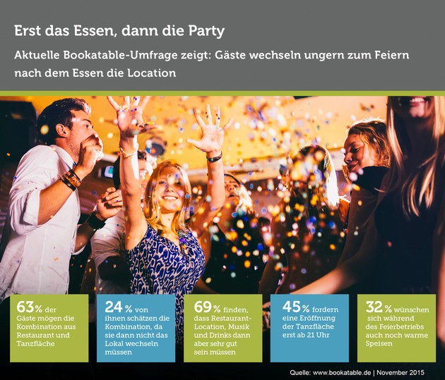 Es ist Samstagabend und was machen wir nun? Essen gehen oder doch lieber tanzen? Oder vielleicht beides? Nur muss man sich dann ja gleich auf zwei verschiedene Locations einigen. Potentielle Diskussionen lassen sich hier leicht umgehen, wenn man sich sofort für ein Restaurant mit Tanzfläche entscheidet. Bookatable, der Online-Reservierungs-Service, fand nun heraus, dass dieses kombinierte Konzept vielen Gästen gut gefällt. Bei einer Umfrage unter gut 650 Restaurantgästen zeigte sich: knapp 63 Prozent der Befragten finden Restaurants mit einer integrierten Tanzfläche sehr praktisch.