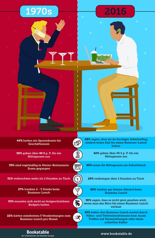 Für gut ein Drittel aller Berufstätigen ist der Business-Lunch eine gerne genutzte Gelegenheit, um mit Geschäftspartnern zu verhandeln oder Beziehungen zu Kunden und Dienstleistern zu pflegen. Eine neue Umfrage im Auftrag von Bookatable, dem Online-Reservierungs-System, unter 600 Angestellten und Selbständigen aus Deutschland bestätigt dies. Bookatable wollte es genauer wissen und befasste sich damit, wie der Business-Lunch sich in den letzten Jahrzehnten verändert hat. Während in den 70er Jahren ein Fünftel der Befragten keine geschäftlichen Mittagessen nutzte, sind es heute nur noch 14 Prozent. Dennoch beklagen fast die Hälfte der Befragten (48 Prozent), dass heute nicht mehr so viel Zeit für ein Kunden-Treffen im Restaurant bleibt. Man beachte, dass früher sogar 44 Prozent der Befragten ein Spesenkonto für Geschäftsessen und Networking besaßen.