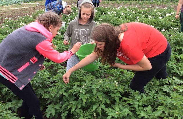 Bildzeile: Schülerinnen der Klasse 6a, Gesamtschule Salzkotten sammeln eifrig Kartoffelkäfer ein. (Bildquelle: m&p: public relations)