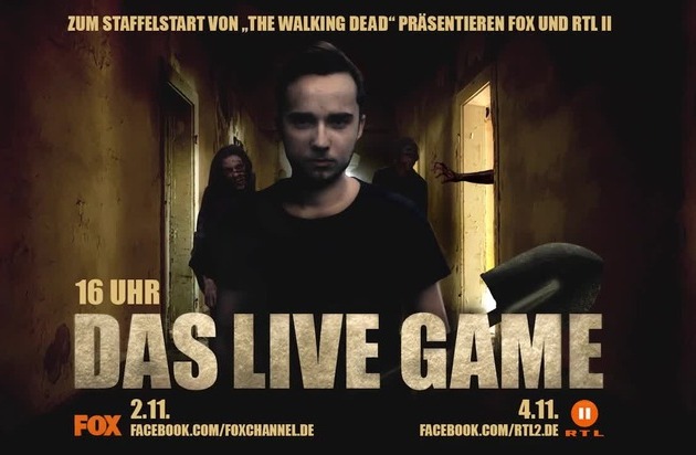 Die YouTube-Stars Jarow und Kurono, die auch bei RTL II YOU eine eigene Sendung haben, spielen live am 2. und 4. November jeweils ab 16:00 Uhr: Sie sind gefangen in einer postapokalyptischen "The Walking Dead"-Welt voller Beißer und werden jeweils plötzlich von ihren Mitstreitern getrennt. Ihre Mission ist es, den Weg zurück zur Gruppe zu finden. Diesen Kampf ums Überleben können die Fans nicht nur live mitverfolgen, sondern in Echtzeit dabei sein und die Handlungen der beiden beeinflussen. Denn sie wissen mehr als die YouTuber und können ihnen mit ihren Tipps helfend zur Seite stehen. Wird die Mission erfüllt, hat jeder Helfer die Chance, 5.000 Euro zu gewinnen. Fans können über die Facebook-Kanäle von FOX (www.facebook.com/foxchannel.de) und RTL II (www.facebook.com/rtl2.de) an diesem einzigartigen Ereignis teilnehmen.