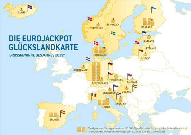 Der höchste deutsche Eurojackpot-Gewinn des Jahres ging mit der Ziehung am 1. Januar 2016 nach Nordrhein-Westfalen. Die Ziehung fand zwar im neuen Jahr statt zählt jedoch zur 53. Kalenderwoche 2015 und wird somit dem alten Jahr zugeordnet. 49.685.851,50 Euro gingen an einen Spielteilnehmer aus dem Großraum Köln. Noch nie gab es einen höheren Gewinn in NRW. Gleiches galt im November 2015 in Baden-Württemberg. Mit 32.657.956,90 Euro war es auch hier Landesrekord.