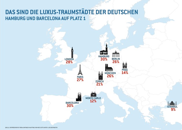 Über drei Viertel der Deutschen träumen von einem luxuriösen Zweitwohnsitz. Darin sind sich die von forsa im Auftrag von WestLotto mehr als 1.000 repräsentativ interviewten Personen einig. WestLotto stellte die Frage, in welchen europäischen Städten die Deutschen gerne einen zweiten Wohnsitz hätten, im Falle eines Lotteriegewinns in Höhe von mindestens 40 Millionen. Hamburg und Barcelona landeten hierbei mit 30 Prozent der Nennungen auf dem ersten Platz. London folgt auf Platz zwei (28 Prozent), Paris auf Platz drei (27 Prozent). Berlin und München verfehlten knapp die Podestplätze, liegen aber in der Gunst der Befragten immerhin auf Platz vier mit 26 Prozent.