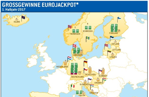 11 Millionäre und 182 weitere Großgewinner im ersten Halbjahr 2017 Europaweit brachte die Lotterie Eurojackpot im 1. Halbjahr 2017 11 Millionäre hervor. Neben sieben deutschen Millionären gab es weitere Millionentreffer in Finnland, Ungarn, Dänemark und den Niederlanden.