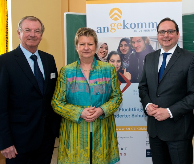 "Angekommen in deiner Stadt Essen" heißt das Projekt für junge Flüchtlinge und Zugewanderte, die die Internationalen Förderklassen der Berufskollegs in Essen besuchen. Im Stadtteil Frohnhausen entsteht dafür in den Räumen der ehemaligen Adelkampschule ein neues Begegnungs- und Bildungszentrum. Mit einer feierlichen Vertragsunterzeichnung legten NRW-Schulministerin Sylvia Löhrmann, Essens Oberbürgermeister Thomas Kufen und Professor Dr. Gunter Thielen, Vorstandsvorsitzender der Walter Blüchert Stiftung, den Grundstein für das gemeinsame Vorhaben.