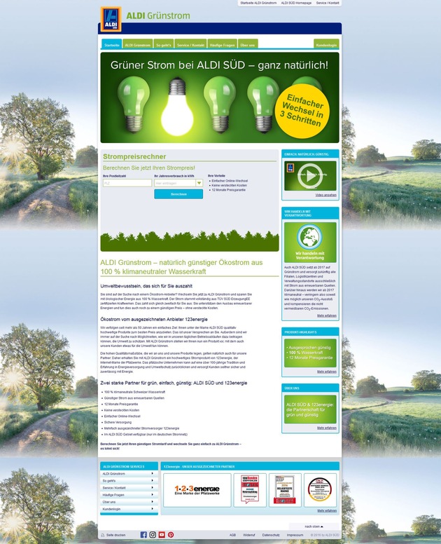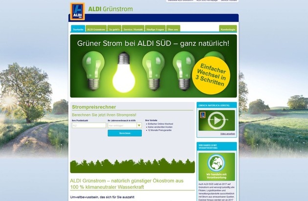 Ab 2017 wird ALDI SÜD klimaneutral handeln. Passend dazu bietet die Unternehmensgruppe unter dem Motto "Einfach. Natürlich. Günstig." künftig auch Grünstrom an: In einer Verkaufsaktion können Kunden im ALDI SÜD Gebiet ab dem 21. November 2016 bis zum 8. Januar 2017 über die Webseite www.aldi-gruenstrom.de nachhaltigen Ökostrom beziehen und so zur Energiewende beitragen.