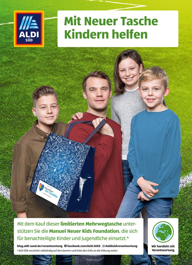 Der Discounter möchte seine Kunden in sein gesellschaftliches Engagement miteinbeziehen. "Mit dem Erwerb der Mehrwegtragetasche können unsere Kunden konkret Kinder und Jugendliche unterstützen, die Dank der Arbeit der Manuel Neuer Kids Foundation Hilfe und ein offenes Ohr finden", sagt Kirsten Geß, Leiterin Kommunikation bei ALDI SÜD.