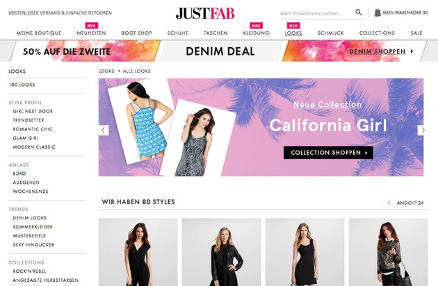 Die neue JustFab Bekleidungslinie setzt auf die aktuellsten Modetrends und bietet Kleider, Jacken, Tops, Jeans und Hosen für jeden Frauentyp und Anlass an. Ab sofort können die Kundinnen das neue Angebot von JustFab durchstöbern und sich nun von Kopf bis Fuß modisch und zu bezahlbaren Preisen einkleiden. Für die passende Inspiration sorgen die JustFab Stylisten mit zusammengestellten Outfits - wer hingegen schon ein genaues Bild vom perfekten Styling vor Augen hat, kann selbstständig die angesagten Trend-Teile entdecken. Das Sortiment wird täglich durch neue Styles und Looks erweitert und bietet schon heute Hunderte von Looks. Bis Ende des Jahres sollen zusätzlich 5.000 neue Modeartikel den Shop bereichern.