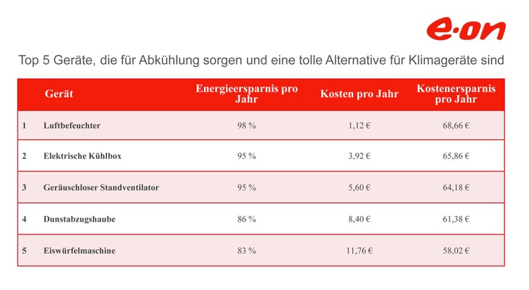 E.ON-Energieexpertin Johanna Lehner weiß, welche Geräte bei Hitze wirklich helfen: "Wir haben das Klimagerät im Vergleich zu Alternativen, wie etwa dem Standventilator getestet. Denn: Klimaanlagen sind Energiefresser, die sich im Portemonnaie extrem bemerkbar machen. Unser Ranking zeigt, dass einige Gadgets nur einen Bruchteil der Energie verbrauchen und damit wesentlich effizienter sind" (siehe beigefügte Grafik).