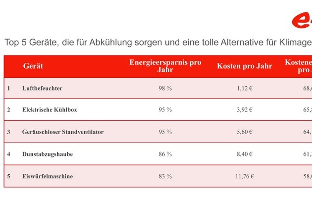 Mit 98 Prozent Energieersparnis liegt beispielsweise der Luftbefeuchter auf Platz 1 des Rankings. Und auch die anderen Gadgets können sich mit Energieersparnissen von über 80 Prozent mehr als sehen lassen. Johanna Lehner erklärt: "Das Klimagerät ist längst nicht mehr das einzige Gerät, mit dem man die Temperatur im Sommer regulieren kann. Viele andere Geräte arbeiten effizienter und sparen gleichzeitig Energie". Die Kostenersparnis ist demnach beachtlich: Wenn die alternativen Geräte über eine Hitzeperiode von acht Wochen jeden Tag fünf Stunden laufen, lassen sich noch einmal bis zu 69 Euro Energie pro Sommer sparen - damit ist der Freibadeintritt mindestens 16mal gesichert.