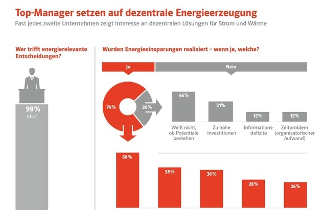Weitere Ergebnisse der Trendstudie: Immer mehr Unternehmen setzen auf eigene Kleinkraftwerke, um ihre Strom- und Heizkosten weiter zu senken. Im Mittelpunkt stehen dabei Blockheizkraftwerke, oft in Kombination mit Photovoltaik-, Solarthermie- oder kleineren Windkraftanlagen. Jeder zweite Geschäftsführer von Unternehmen mit einem Umsatz von mehr als 50 Millionen Euro interessiert sich für diese Form der dezentralen Stromerzeugung. Je größer das Unternehmen, desto höher das Interesse am eigenen Kraftwerk.