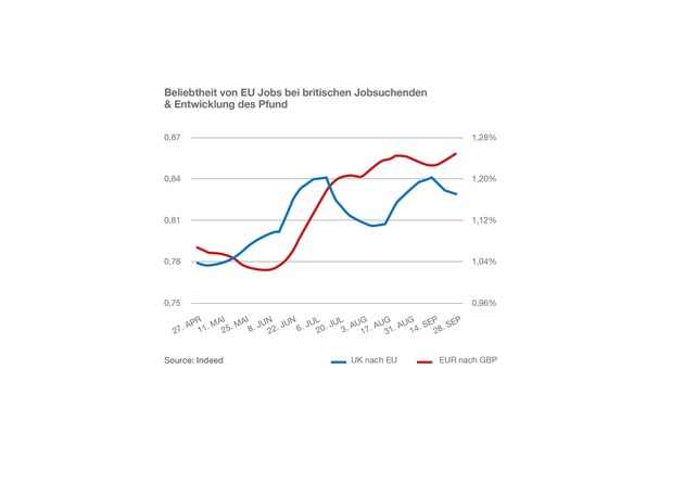 Ein Blick auf die Jobsuchen aus UK in alle anderen EU-Länder zusammengenommen zeigt, dass sich der Anstieg auf bescheidene 7% summiert. Allerdings belegt die Analyse bemerkenswerte Parallelen zwischen UK-Jobsuchen in die EU und der Entwicklung des Pfund. Am Tag des Referendums entsprach ein Euro 76 britischen Cents, nun kann man mit einem Euro ganze 90 Cents kaufen.