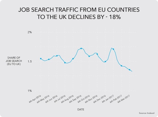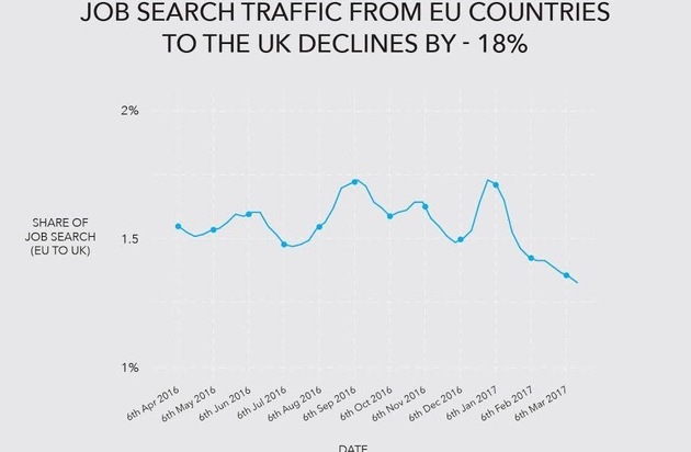 - Die Zahl der Europäer, die online einen Job in Großbritannien suchen, ist seit Januar 2017 um 18 Prozent zurückgegangen.