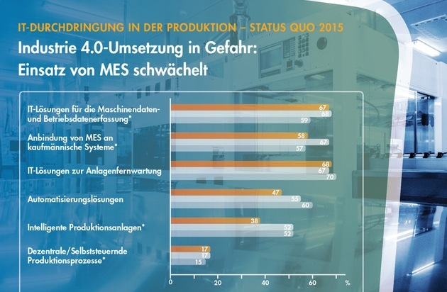 Für die repräsentative Untersuchung befragte das Marktforschungsinstitut PAC zum dritten Mal rund 130 IT-Entscheider und Produktionsleiter mittelständischer Fertigungsunternehmen in Deutschland. Die befragte Unternehmensgruppe setzt sich aus folgenden Branchen zusammen: Maschinen- und Anlagenbau (30 Prozent), Automotive (28 Prozent) sowie sonstige Fertigung (42 Prozent) mit einer Mitarbeiterzahl von 250 bis 499 (40 Prozent) beziehungsweise 500 bis 4.499 (60 Prozent).