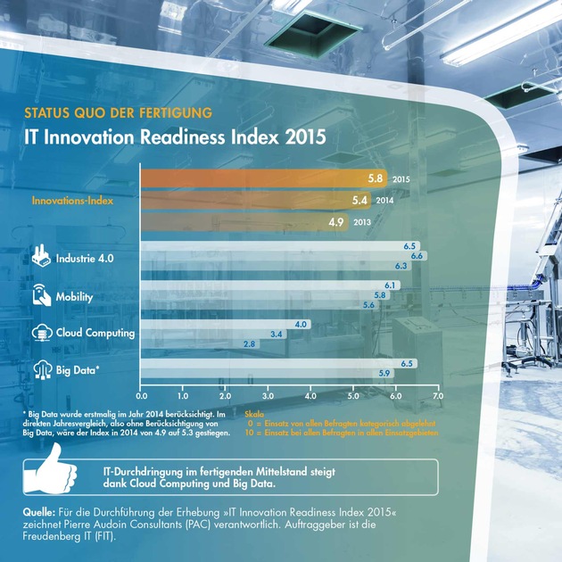 Der IT-Innovations-Index der mittelständischen Fertigungsindustrie liegt auf einer Skala zwischen 0 und 10 derzeit bei 5,8 - und damit 0,4 Indexpunkte über dem Vorjahreswert. Dieses Fazit zieht die jährliche Erhebung "IT Innovation Readiness Index" von Pierre Audoin Consultants (PAC) im Auftrag der Freudenberg IT. Der Innovations-Index fasst den jeweiligen Status quo der von PAC analysierten Megatrends Industrie 4.0, Mobility, Cloud Computing und Big Data als Mittelwert zusammen. Mit einem Anstieg von jeweils 0,6 Indexpunkten erweisen sich dabei Cloud Computing und Big Data aktuell als die Zugpferde der Digitalisierung im produzierenden Gewerbe.