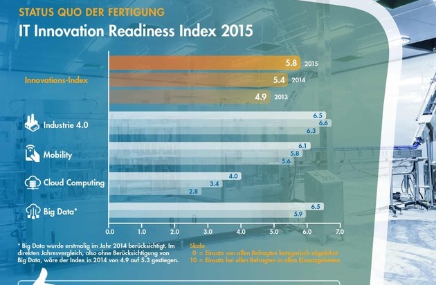 Der IT-Innovations-Index der mittelständischen Fertigungsindustrie liegt auf einer Skala zwischen 0 und 10 derzeit bei 5,8 - und damit 0,4 Indexpunkte über dem Vorjahreswert. Dieses Fazit zieht die jährliche Erhebung "IT Innovation Readiness Index" von Pierre Audoin Consultants (PAC) im Auftrag der Freudenberg IT. Der Innovations-Index fasst den jeweiligen Status quo der von PAC analysierten Megatrends Industrie 4.0, Mobility, Cloud Computing und Big Data als Mittelwert zusammen. Mit einem Anstieg von jeweils 0,6 Indexpunkten erweisen sich dabei Cloud Computing und Big Data aktuell als die Zugpferde der Digitalisierung im produzierenden Gewerbe.