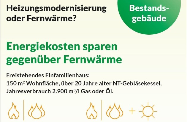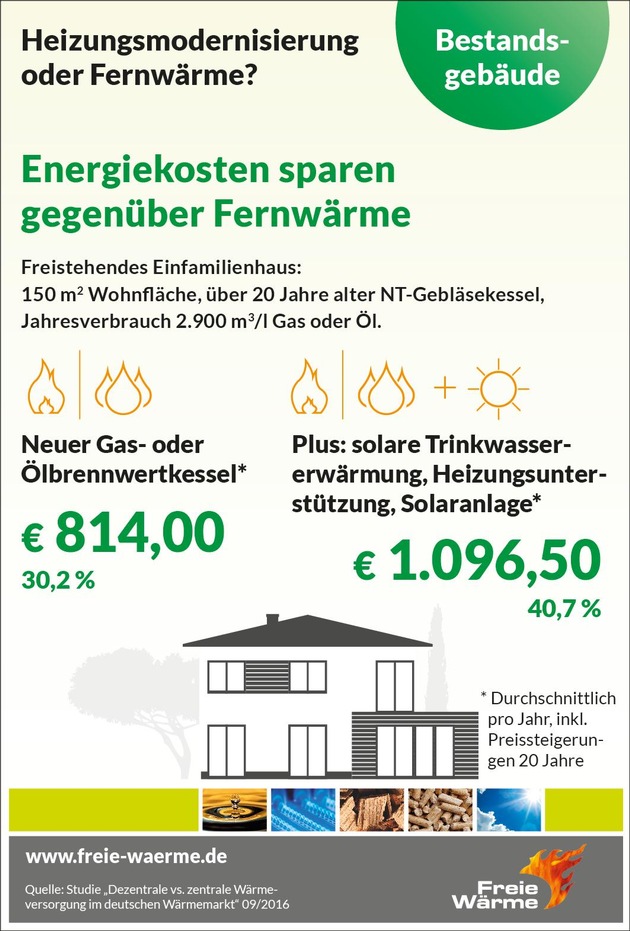 Allein schon die Heizungsmodernisierung im 150 Quadratmeter großen Einfamilienhaus mit veraltetem Niedertemperaturkessel lohnt sich: Betrachtet man danach die jährliche Einsparung bei den Energiekosten gegenüber dem Ausgangszustand, so spart man nur durch die neue Heizungsanlage mit Öl-/Gas-Brennwerttechnik jährlich 831 Euro (30,8 %). Gegenüber der Fernwärme betrachtet, und je nach Einbindung von Solarthermie, lassen sich nach der Modernisierung die Energiekosten um bis zu 1.096 Euro pro Jahr (40,7 %) senken - inkl. Einberechnung einer Preissteigerung über 20 Jahre.