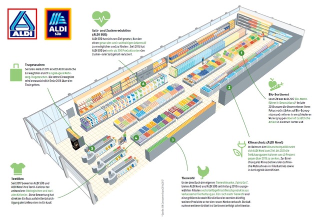 Zusammen mit dem Nachhaltigkeitsbericht veröffentlicht ALDI Nord eine Klimaschutzpolitik mit dem Ziel, bis 2021 die Treibhausgasemissionen um 40 Prozent gegenüber 2015 zu senken. Zur Erreichung des Klimaziels wurden zahlreiche Maßnahmen im Filialbetrieb sowie in der Logistik identifiziert. Die langfristig ausgerichtete Klimastrategie umfasst beispielsweise den Ausbau von Fotovoltaikanlagen sowie den Einsatz von LED-Beleuchtung und innovativer Kältetechnik. ALDI SÜD wird einen weiteren Schwerpunkt auf den Bereich gesunde Ernährung legen. Seit 2014 hat der Discounter bei mehr als 300 Produktsorten den Zucker- oder Salzgehalt reduziert.