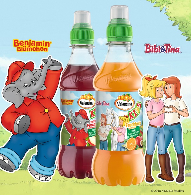 Die neuen Valensina KIDS Fruchtmixe enthalten nur reinen Fruchtsaft in Verbindung mit Wasser. Mit der natürlichen Rezeptur ohne jeden Zusatz kann Valensina KIDS den klassischen Durstlöscher Wasser optimal ergänzen. Die praktische Flasche mit Sportscap-Verschluss begleitet Kinder unkompliziert durch den Tag. Der frische, natürliche Geschmack und die beliebten Lizenzfiguren* "Benjamin Blümchen" und "Bibi & Tina" sorgen für viel Spaß und stellen sicher, dass Kinder das Trinken nicht vergessen.