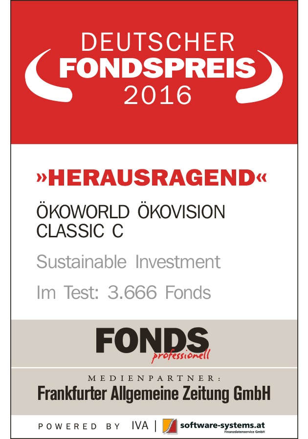 Im Segment "Sustainable Investment" wird der ÖKOWORLD ÖKOVISION CLASSIC (WKN 974968) als "HERAUSRAGEND" beurteilt und gewinnt den DEUTSCHEN FONDSPREIS 2016 in Mannheim.