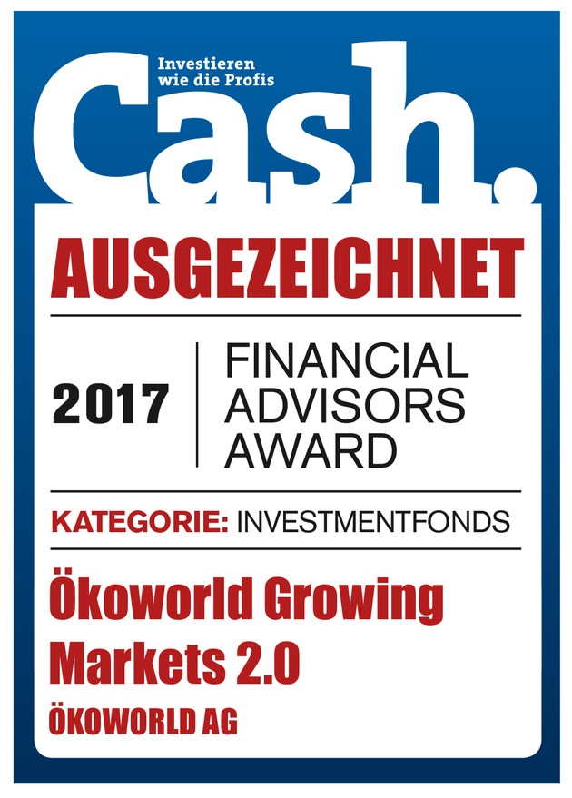 Alexander Mozer berichtete den Gästen auf der Cash. Gala in seiner Dankesrede: "Mit einem aktuellen Gewicht von 120 Mio. Euro hat unser ÖKOWORLD GROWING MARKETS 2.0 seit seiner Geburt vor 5 Jahren am 17. September 2012 ordentlich zugelegt. Gestartet sind wir mit 8. Mio. Euro. Der Fonds hat jedes Jahr eine positive Rendite von gut 11% erzielt, die die Anleger 1:1 als Plus in ihrem Depot sehen. Denn bei dieser Performanceangabe sind selbstverständlich, wie bei allen unseren veröffentlichten Performanceangaben, die Kosten bereits herausgerechnet. Die Outperformance gegenüber dem Standardindex MSCI Emerging Markets kumuliert sich auf über 30%. Wir setzen in den wachsenden Ländern auf die Entwicklung 2.0. Weg vom Rohstoffexport und der verlängerten Werkbank, hin zu Bevölkerungswachstum und einer aufstrebenden Mittelschicht mit der Entwicklung spezifischer Bedürfnisse, die auch über die Grundbedürfnisse hinausgehen. Unser Erfolg freut unsere Investoren und bestätigt unsere Strategie."