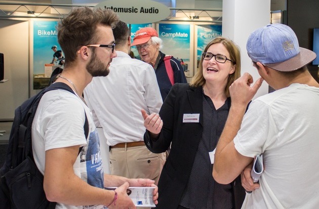Bildunterschrift Foto 1: Informierte anlässlich der Preisverleihung über Kinder-Hörgerät ReSound Up Smart - Vertriebsaudiologin Steffi Ramlow (Mitte), Spezialistin für die Pädakustik-Produkte von ReSound (hier beim IFA-Auftritt des Herstellers 2016) (Foto: ReSound).