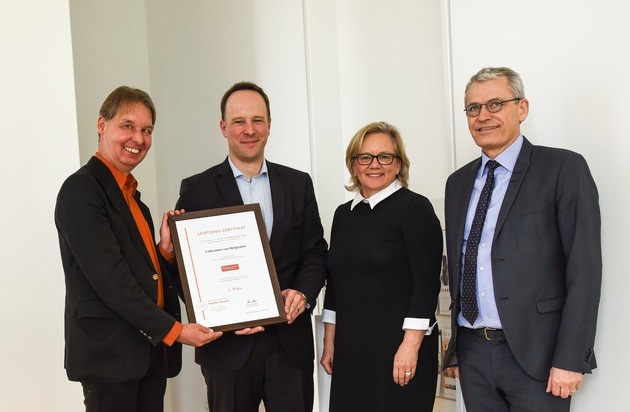 Das beigefügte Pressefoto dürfen Sie im Zusammenhang mit unserer Meldung frei verwenden. Bildunterschrift: ReSound belegt Platz 1 beim Leistungsspiegel der Hörgeräte-Hersteller - 'markt intern'-Redakteur Carsten Schmitt (li.) überreicht Joachim Gast (2. v. li.), Geschäftsführer von ReSound Deutschland, sowie Helen Ljungdahl Round (2. v. re.), Head of Global Marketing, und Anders Hedegaard (re.), CEO GN Store Nord und GN Hearing, die Gewinner-Urkunde (Foto: ReSound).