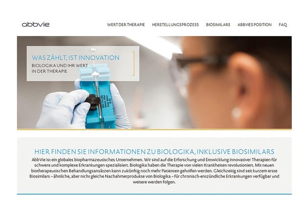 Aus Sicht von AbbVie müssen bestimmte Rahmenbedingungen für einen qualitätsgesicherten Einsatz von Biologika, inkl. Biosimilars, gelten. Hierzu zählen eigene Wirkstoffnamen (INN) für Originalpräparat und Biosimilar, Transparenz in Produkt- und Gebrauchsinformationen in Bezug auf die durchgeführten Studien, Aufnahme von Biosimilars in bestehende Biologika-Register und den Ausschluss von Substitutionen in der Apotheke in diesem Bereich. Wichtigste Voraussetzung für eine erfolgreiche Biologika-Therapie ist nämlich, dass die Therapiefreiheit der Ärzte und die Therapievielfalt für die Patienten erhalten bleiben. Diese Forderungen sind unter "Position AbbVie" zusammengefasst. Gleichzeitig warten viele Patienten mit bislang unerfüllten medizinischen Bedürfnissen auf Medikamente mit neuen Wirkmechanismen. Hierfür braucht es kontinuierliche innovative Forschung, auch im Bereich der Biologika-Therapie. Deshalb arbeitet AbbVie auch weiterhin an neuen, zielgerichteten Therapien, unter anderem mit Biologika, besonders für Patienten, die bislang noch nicht zufriedenstellend zu behandeln sind.