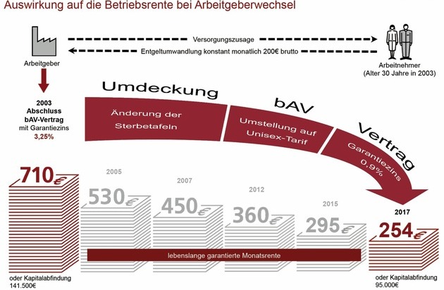 Wer sich aus seinem alten bAV-Vertrag mit monatlich 710 Euro garantierter Betriebsrente ab 2017 in einen Neuvertrag locken lässt, bekommt zum Renteneintritt mit 67 Jahren nur noch monatlich 254 Euro, wie aktuelle Erhebungen der Deutschen Gesellschaft für betriebliche Altersversorgung (DGbAV) ergeben. Das Renten-Minus addiert sich jährlich zu rund 5.500 Euro. Nach den gerade veröffentlichten Generationensterbetafeln* leben Männer ab Rentenbeginn noch 20 Jahre, Frauen sogar 23 Jahre. Die Rechnung: Eine um 5.500 Euro jährlich geringere Betriebsrente addiert sich in 20 Jahren Rentnerdasein auf mehr als 100.000 Euro, die im Ruhestand fehlen.