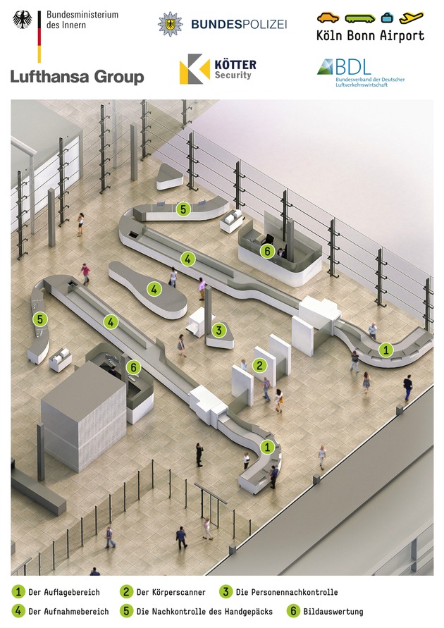 Am Flughafen Köln/Bonn brechen neue Zeiten für Passagiere und Sicherheitskräfte an. Dort wird in wenigen Tagen die innovative Sicherheitskontrollfläche "Easy Security" in den Probetrieb genommen. "Easy Security" vereint den neuesten Stand der Technik mit Funktionalität und Ergonomie zu einem ganzheitlichen Konzept: Bei konstant hohem Sicherheitsniveau soll der Kontrollprozess sowohl für Passagiere als auch für das Personal einfacher, effizienter und zugleich angenehmer gestaltet werden. Dafür wurden auf Initiative des Bundesinnenministeriums (BMI) und des Bundesverbandes der Deutschen Luftverkehrswirtschaft (BDL) in enger Zusammenarbeit mit den Partnern vor Ort - der Bundespolizei, dem Sicherheitsdienstleister KÖTTER Aviation Security, dem Flughafen Köln/Bonn und der Lufthansa Group - die bestehenden Abläufe analysiert und Optimierungsmöglichkeiten identifiziert.