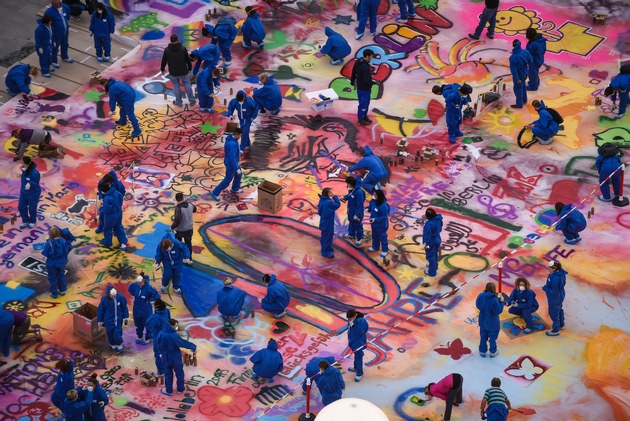 Anlässlich des zehnjährigen Jubiläums des Wettbewerbs "Ausgezeichnete Orte im Land der Ideen" wurde heute das viertägige Festival der Ideen auf dem Washingtonplatz vor dem Berliner Hauptbahnhof mit der Enthüllung eines 600 Quadratmeter großen Streetart-Kunstwerks feierlich eröffnet. Gemeinsam mit den Künstlern von "artmos4" und dem "StreetArt Festival Wilhelmshaven" hatten Berlinerinnen und Berliner, aber auch Gäste aus dem In- und Ausland, Neugierige und Kunstinteressierte bereits am Vorabend bewiesen: Deutschland sprüht vor Ideen. Rund 600 Teilnehmer jeden Alters sprühten ihre Ideen mit der Hilfe internationaler Streetart-Künstler bis tief in die Nacht auf die große Fläche. Dahlien, Brezeln, eine Glühbirne, Schriftzüge zum zehnjährigen Jubiläum wurden auf der Deutschlandkarte verewigt. Das kreative und bunte Ergebnis begeisterte Streetart-Künstler und interessierte Zuschauer gleichermaßen.
