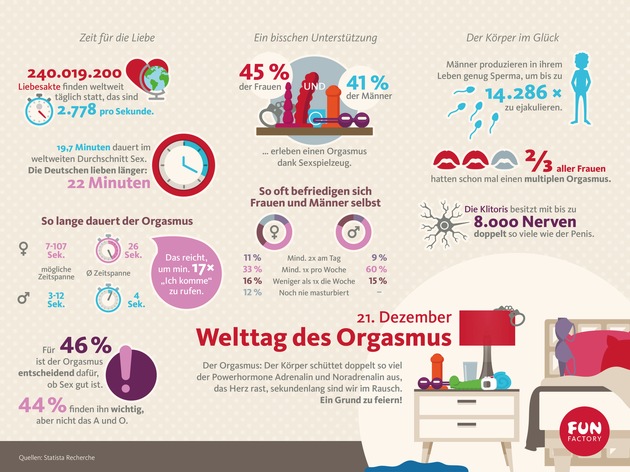 Dem Bremer Sextoy-Hersteller Fun Factory liegen schöne Höhepunkte ihrer Kundinnen und Kunden und vor allem ein aufregender und erregender Weg dorthin schon seit knapp 20 Jahren am Herzen. "Und da lag es doch ganz besonders nah, dass wir einmal ein paar Fakten und Anekdoten gesammelt haben, um dem Welttag des Orgasmus zu huldigen", so Unternehmenssprecherin Kristy Stahlberg. "Mit unseren Produkten, unserer Philosophie und der damit verbundenen Aufklärungsarbeit kommen wir dem Ziel das Thema Sexualität in die Mitte der Gesellschaft zu bringen jeden Tag ein Stückchen näher."