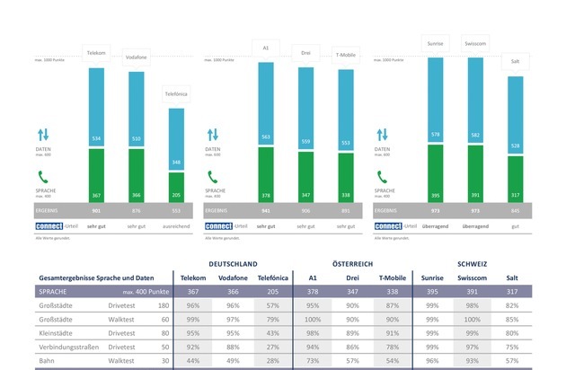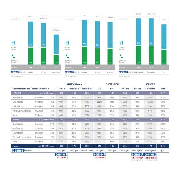 In der Schweiz kommt es dieses Jahr überraschend zu einem Doppelsieg auf höchstem Niveau. Vorjahressieger Sunrise und Markführer Swisscom teilen sich das Siegerpodest mit jeweils 973 Punkten. Zum ersten Mal in der Geschichte des Netztests in Deutschland, Österreich und der Schweiz vergibt connect die Gesamtnote "überragend" an zwei Anbieter aus demselben Land. Der kleinste Schweizer Anbieter Salt verbessert sich in diesem Jahr in der Datendisziplin, büßt jedoch in der Sprachwertung Punkte ein und schneidet mit 845 Punkten mit "gut" ab.