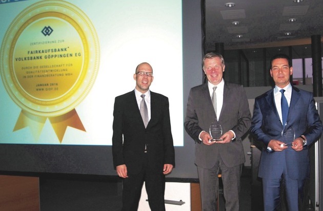 Die Gesellschaft für Qualitätsentwicklung in der Finanzberatung mbH (QIDF) konnte die Volksbank Göppingen eG im Rahmen der Jahresauftaktveranstaltung 2016 als erste Bank deutschlandweit mit dem Siegel "FAIRkaufsbank" (QIDF) auszeichnen.