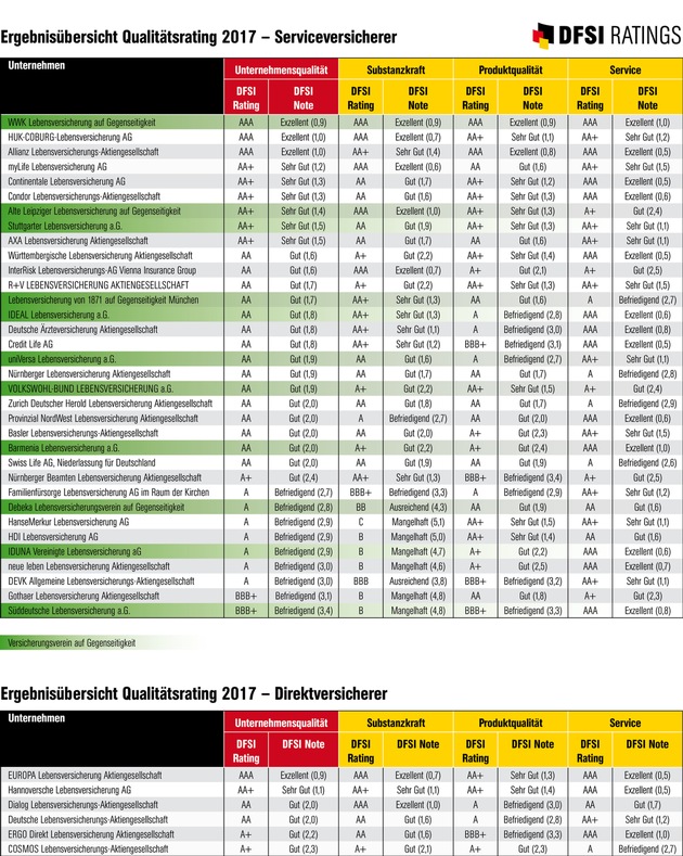 Um Vermittlern und Verbrauchern hier eine leicht verständliche aber dennoch differenzierende Hilfestellung zu geben, erarbeitete die DFSI Ratings GmbH auch 2017 wieder Qualitätsratings zu insgesamt 40 marktrelevanten Lebensversicherern, darunter sechs Direktversicherer und 34 Service-Versicherer.