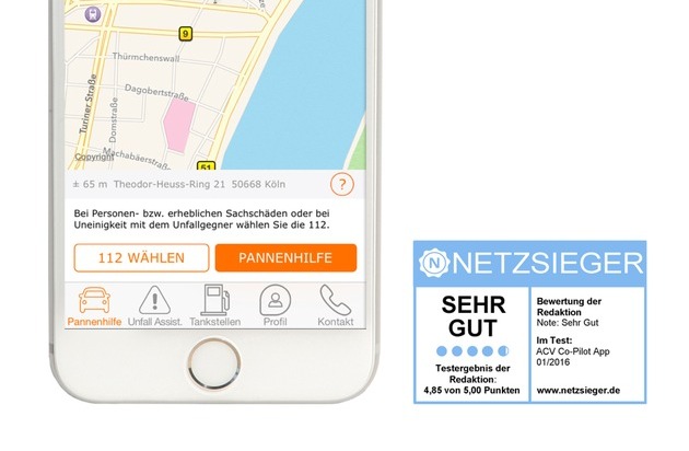 Die Unfall- und Pannenhilfe App des ACV Automobil-Club Verkehr ACV Co-Pilot wurde vom unabhängigen Vergleichsportal Netzsieger.de mit sehr gut bewertet. Die App wurde auf Funktionen und Nutzerfreundlichkeit getestet und erzielte in der Gesamtbewertung 4,85 von 5,00 möglichen Punkten.