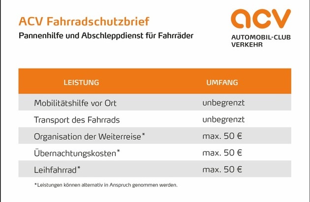 Übersichtliche Infos zum ACV Fahrradschutzbrief finden Sie hier: www.acv.de/mitgliedschaft/fahrradschutzbrief/