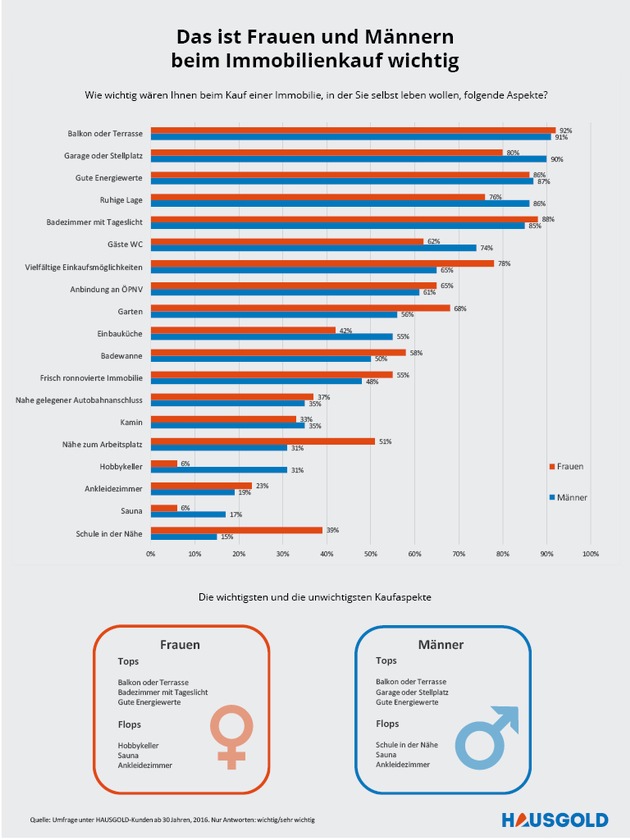 Wenig Wert legen Frauen auf einen Hobbykeller und eine eigene Sauna. Jeweils nur 6 Prozent der Frauen bewerteten das Vorhandensein von Hobbykeller und Sauna als wichtig. Im Vergleich: Fast ein Drittel der Männer (31 Prozent) gaben an, dass ihnen ein Hobbykeller wichtig sei. Unwichtig ist den Männern dagegen, ob sich eine Schule in unmittelbarer Nähe befindet, nur 15 Prozent bewerten das als wichtig. Die Schule ist für Männer damit das unwichtigste Kaufkriterium, gefolgt von Sauna (17 Prozent) und Ankleidezimmer (19 Prozent). Ein Ankleidezimmer ist - allen Klischees zum Trotz - nur 23 Prozent der Frauen wichtig und nimmt im Ranking der unwichtigsten Aspekte auch bei Frauen Platz 3 ein.
