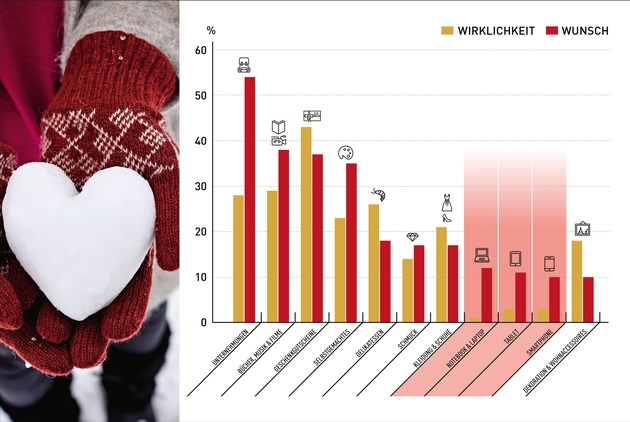 Die Deutschen verschenken übrigens nach wie vor lieber "die Klassiker" als Technikschnickschnack. Mehr als jeder Vierte wird in diesem Jahr Delikatessen auf den Gabentisch legen, obwohl nur 18 Prozent der Deutschen das als Weihnachtsgeschenk wirklich möchten. Auch Deko-Artikel und Wohnaccessoires werden häufiger verschenkt als es den meisten lieb wäre.