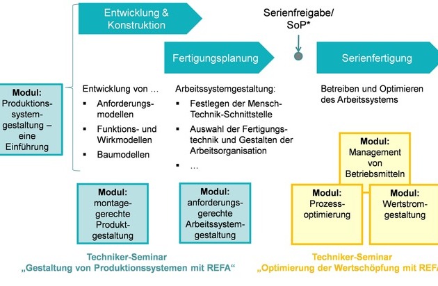 Vor diesem Hintergrund hat das REFA-Institut die Ausbildung zum REFA-Techniker für Industrial Engineering grundlegend überarbeitet. Auf Basis der REFA-Grundausbildung 2.0 werden dort zunächst Fach- und Methodenkompetenzen in den Bereichen Produktionsplanung, Kostencontrolling, Qualitätsmanagement und Organisationmanagement vermittelt. In den beiden neuen Seminaren "Gestaltung von Produktionssystemen mit REFA" und "Optimierung der Wertschöpfung mit REFA" erwerben die Teilnehmer durch die aktive Bearbeitung verschiedener Fallstudien und Planspiele Handlungs- und Problemlösekompetenz für die ganzheitliche Gestaltung von Prozessen und Arbeitssystemen. Die Seminare, die im Juni 2015 erstmalig durchgeführt wurden, kamen bei den Teilnehmern aufgrund des hohen Praxisbezugs hervorragend an.